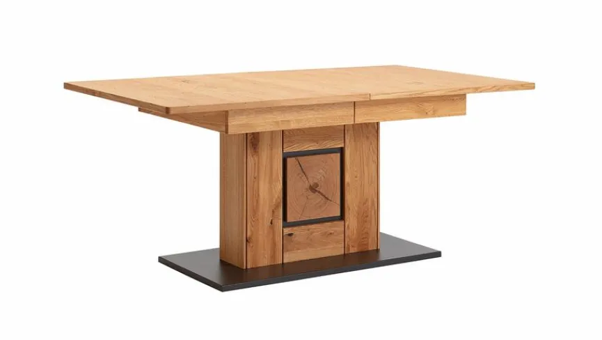 - Tischsäule aus Ast/Balkeneiche massiv mit durchgehender Lamelle in Wildeiche geölt, Absetzung durch Hirnholzblöcke in Ast/Balkeneiche massiv/furniert in Wildeiche geölt
