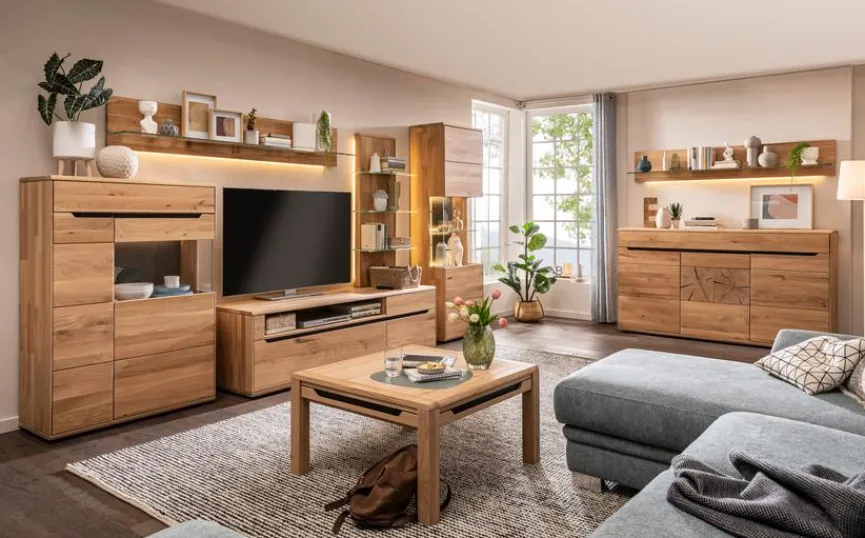 Dank ihrer trendigen Asymmetrie ist die schicke Wohnwand Melilla ein echter Hingucker in jeder Wohnkulisse. Sie kommt mit natürlich gemaserten Echtholz-Fronten und filigranen Griffen daher und trifft so souverän den gestalterischen Nerv der Moderne. Kombinieren Sie die Wohnwand Melilla mit anderen Möbeln im passenden Holzton!