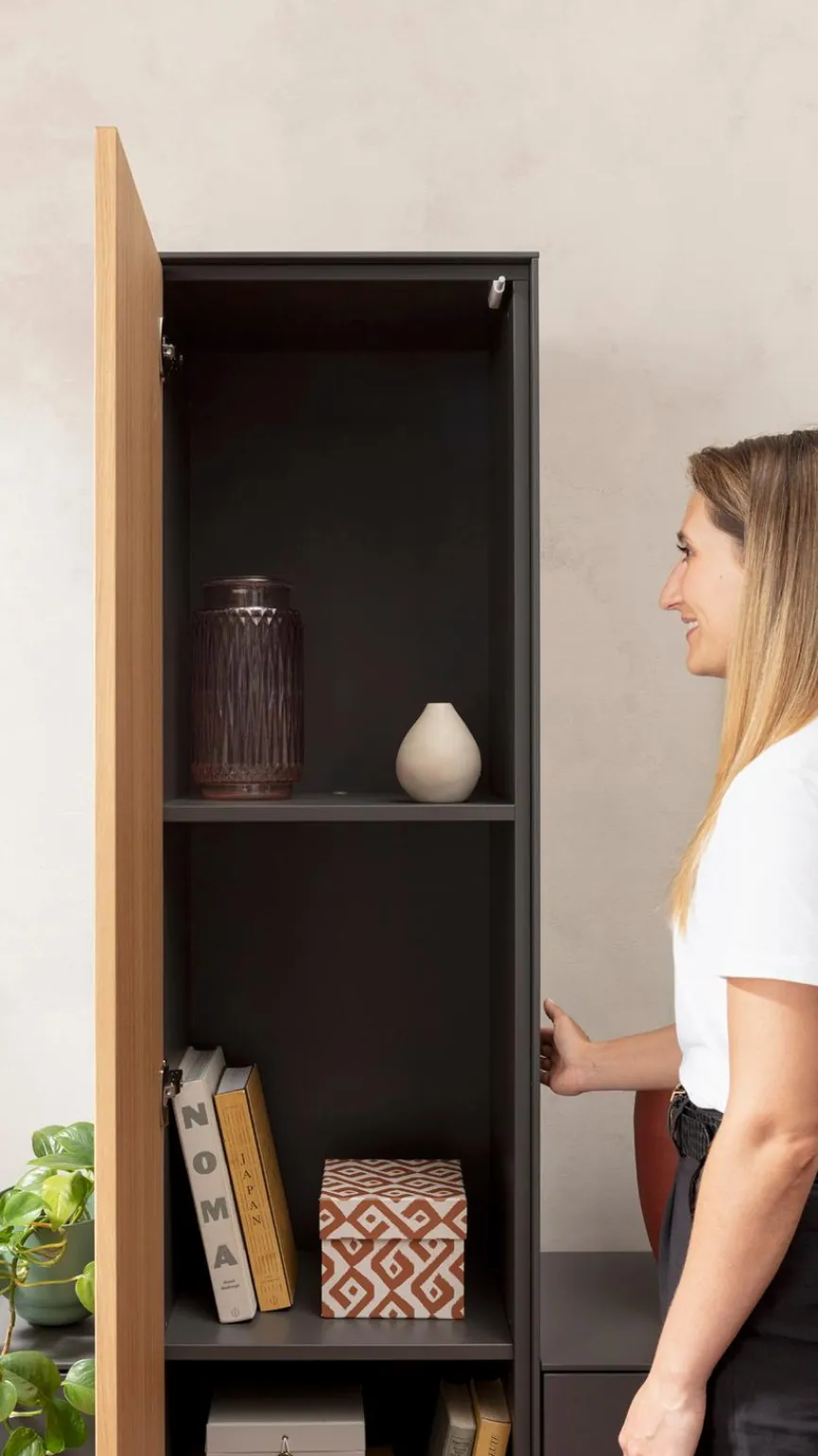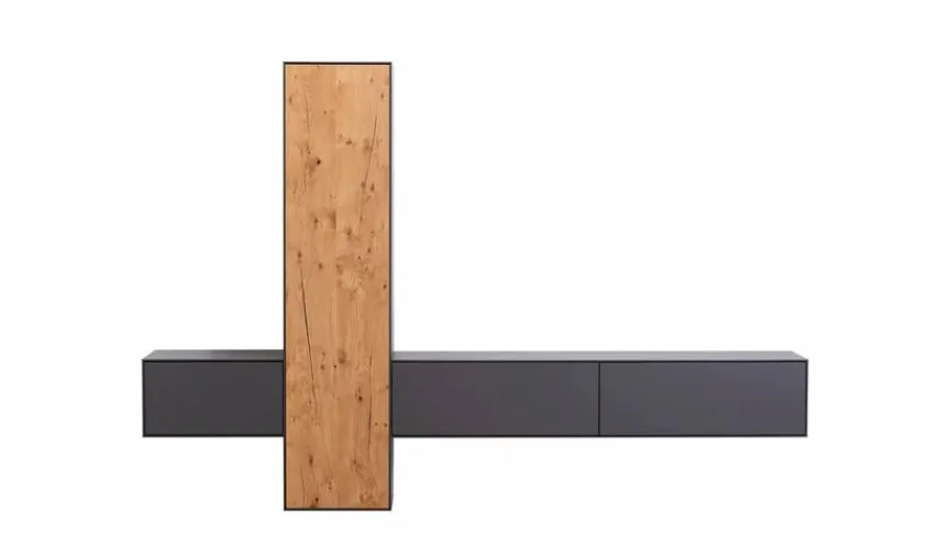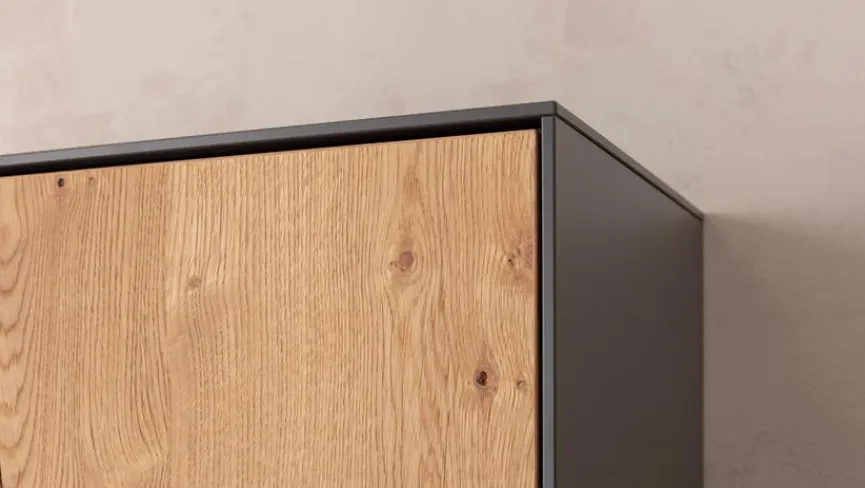 - Front der Hängeelemente aus Melaminharzfolie in Schiefergrau, Front des Standelements aus Echtholzfurnier in Riffeiche