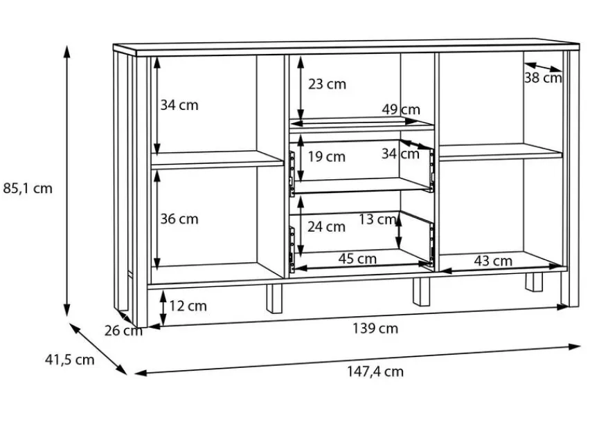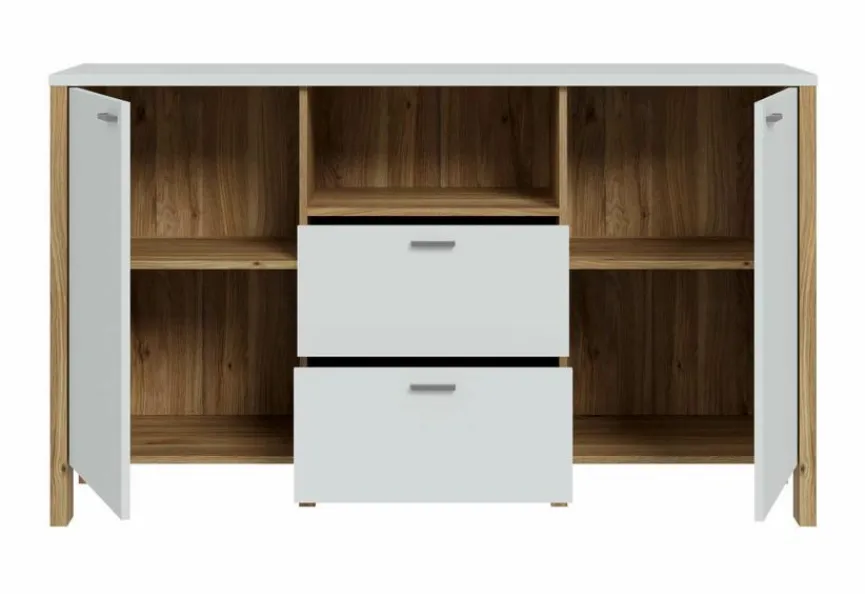 - Mit 2 Türen, 2 Einlegeböden, 2 Schubkästen und 1 offenen Fach