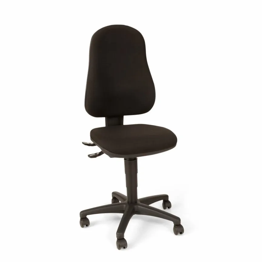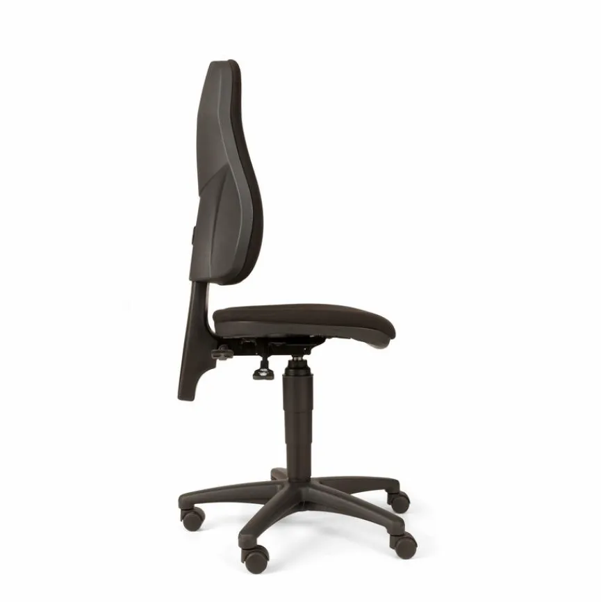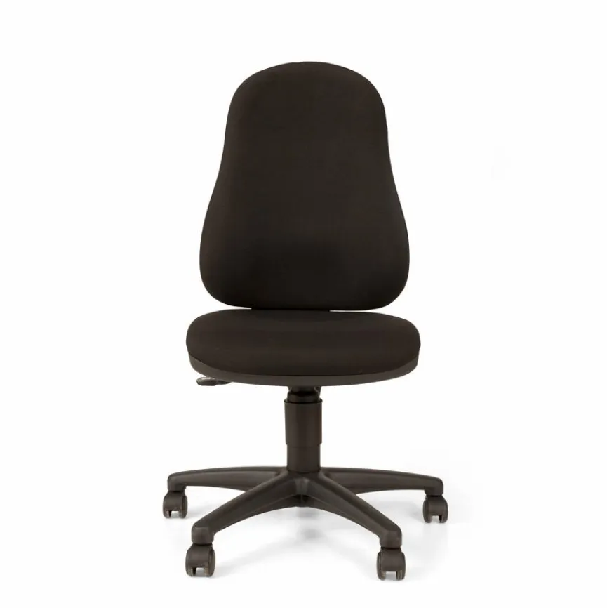 - Bezug aus Stoff in schwarz, Fußkreuz aus Kunststoff in schwarz, mit konturgeformte Rückenlehne mit integrierter Lendenwirbelstütze, Muldensitz mit Beckenstütze