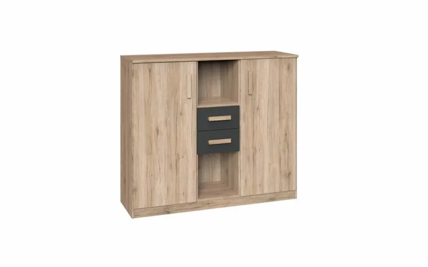 - Mit 2 Türen, 2 Einlegeböden, 2 Schubkästen und 2 offenen Fächern