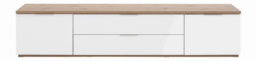 - Korpus und Front aus Holzwerkstoff (Spanplatte) mit kratzfester Melaminharzfolie in Hochglanz Weiß, Absetzung aus Holzwerkstoff (Spanplatte) mit kratzfester Melaminharzfolie in Eiche Artisan