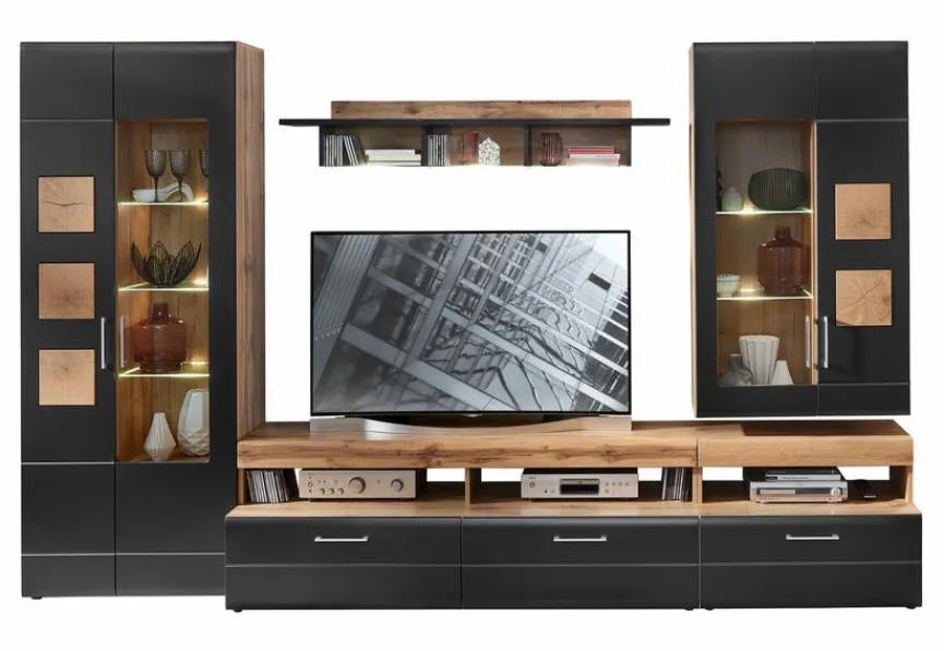 - Bestehend aus: 2 TV-Lowboards, 1 Hängevitrine, 1 Standvitrine und 1 Wandboard