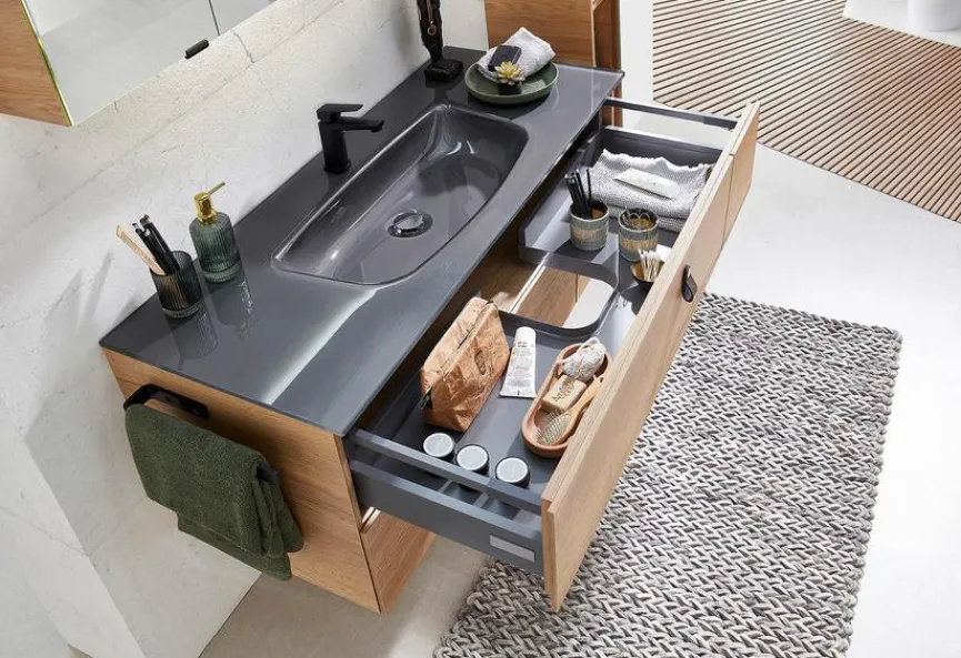 - Waschtischunterschrank mit 2 Auszügen und mit asymmetrischer Frontoptik (rechts)