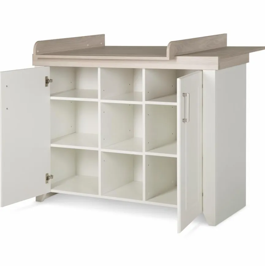 Die Wickelkommode Felicia von roba Baumann wirkt dank der zweifarbigen Gestaltung sehr modern. Ausgestattet ist der Wickeltisch unter anderem mit zwei Türen. In der Mitte befinden sich drei offene Fächer für alle Gegenstände, die schnell griffbereit sein sollen. Der Aufsatz ist bei der Wickelkommode Felicia von roba Baumann farblich abgesetzt.