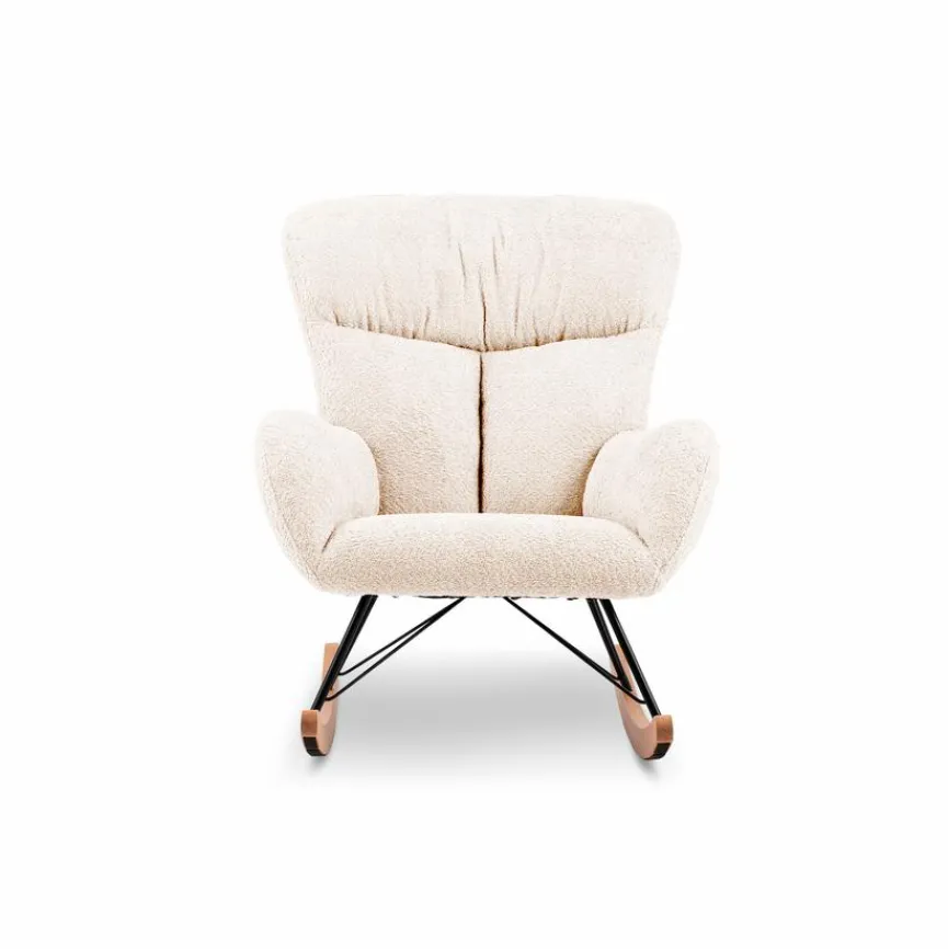 - Bezug aus Stoff in beige, Beine aus Metall in schwarz und Kufe aus Holz in Buche massiv