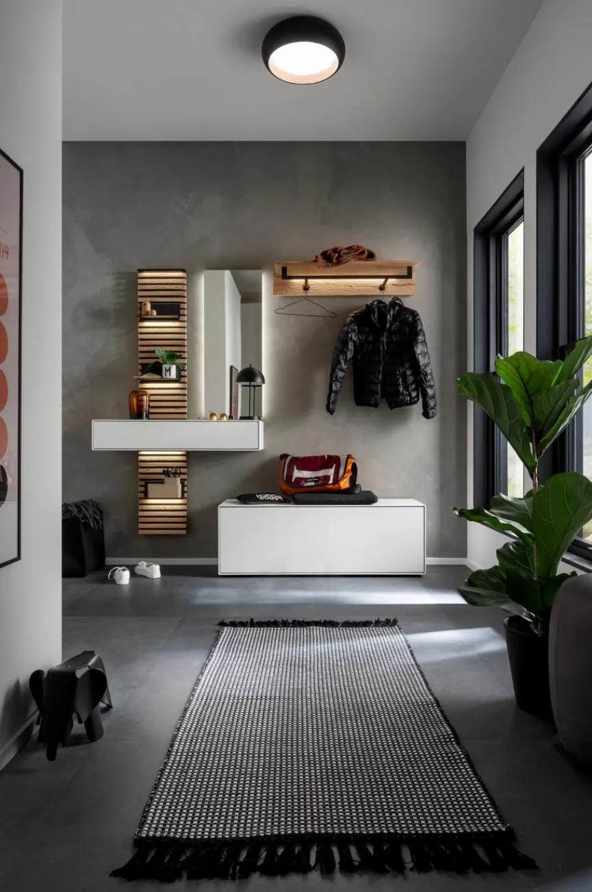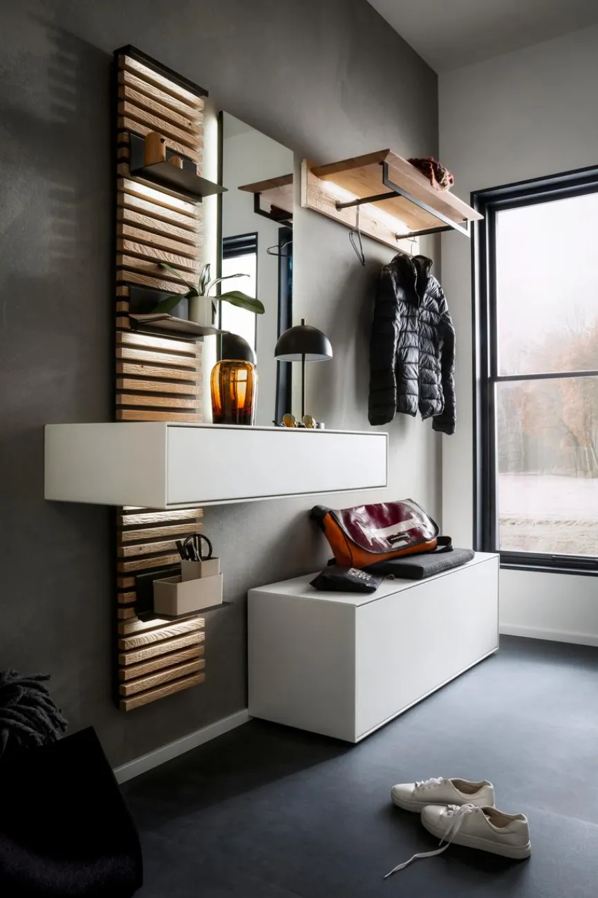 - Bestehend aus: Regalelement, Spiegel, Garderobenbank, Wandgarderobe, Paneelbeleuchtung, Bodenbeleuchtung, Spiegelbeleuchtung und Sitzkissen