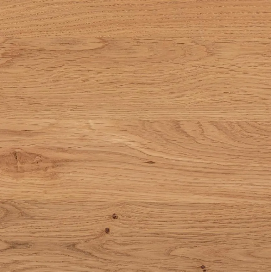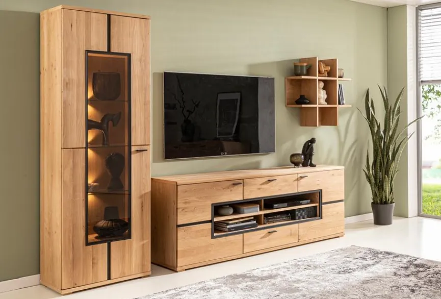 - Front aus vollmassiver Wildeiche, Korpus aus Holzwerkstoff (Spanplatte) mit hochwertiger Dekorfolie in Wildeiche furniert, Absetzung aus geölter Natureiche mit Ornament in Anthrazit