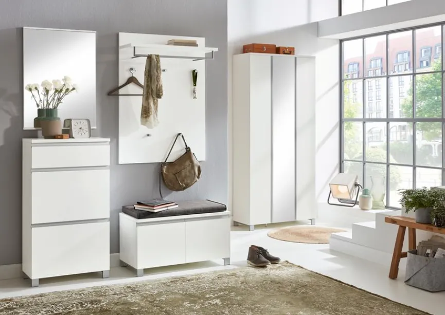 - Garderobe aus Schuhschrank, Spiegel, Garderobenbank, Sitzkissen, Garderobenpaneel und Garderobenschrank