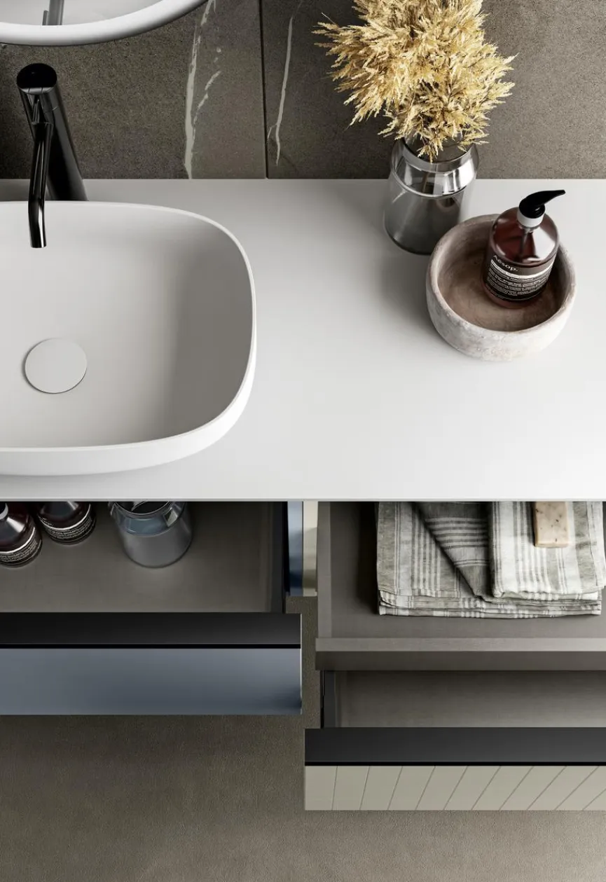 - Waschtischunterschrank mit 1 Auszug mit der Fronttype Plain in indigo matt lackiert, inkl Griffleiste in schwarz matt