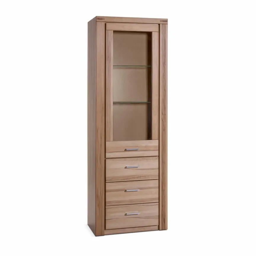 Fronten aus geöltem Massivholz verleihen der Vitrine Tabea eine sehr wohnlich wirkende Optik, die sehr viel Wärme und Gemütlichkeit ausstrahlt. Aber auch die moderne Note kommt bei dieser Glasvitrine nicht zu kurz. Grund hierfür ist die geradlinige, puristische anmutende Formgebung, mit der die Vitrine Tabea aufwartet.