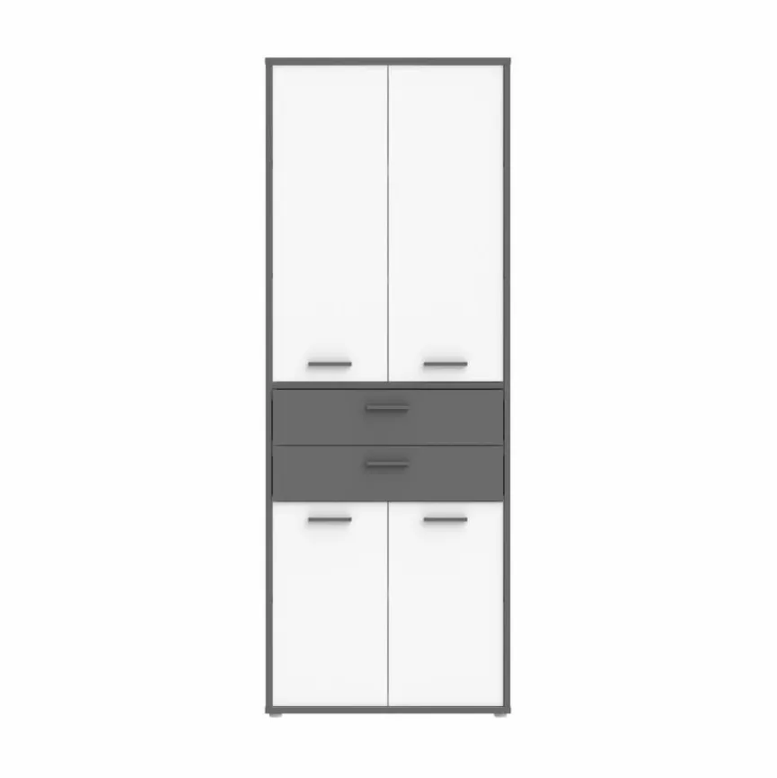 - Aus Holzwerkstoff (Spanplatte) in Weiß, Kontrastkante und Schubkästen aus Holzwerkstoff (Spanplatte) in Uni Wolfram Grau, Rückwand aus Holzwerkstoff (HDF-Platten) in Weiß, Griffe aus Kunststoff in Grau