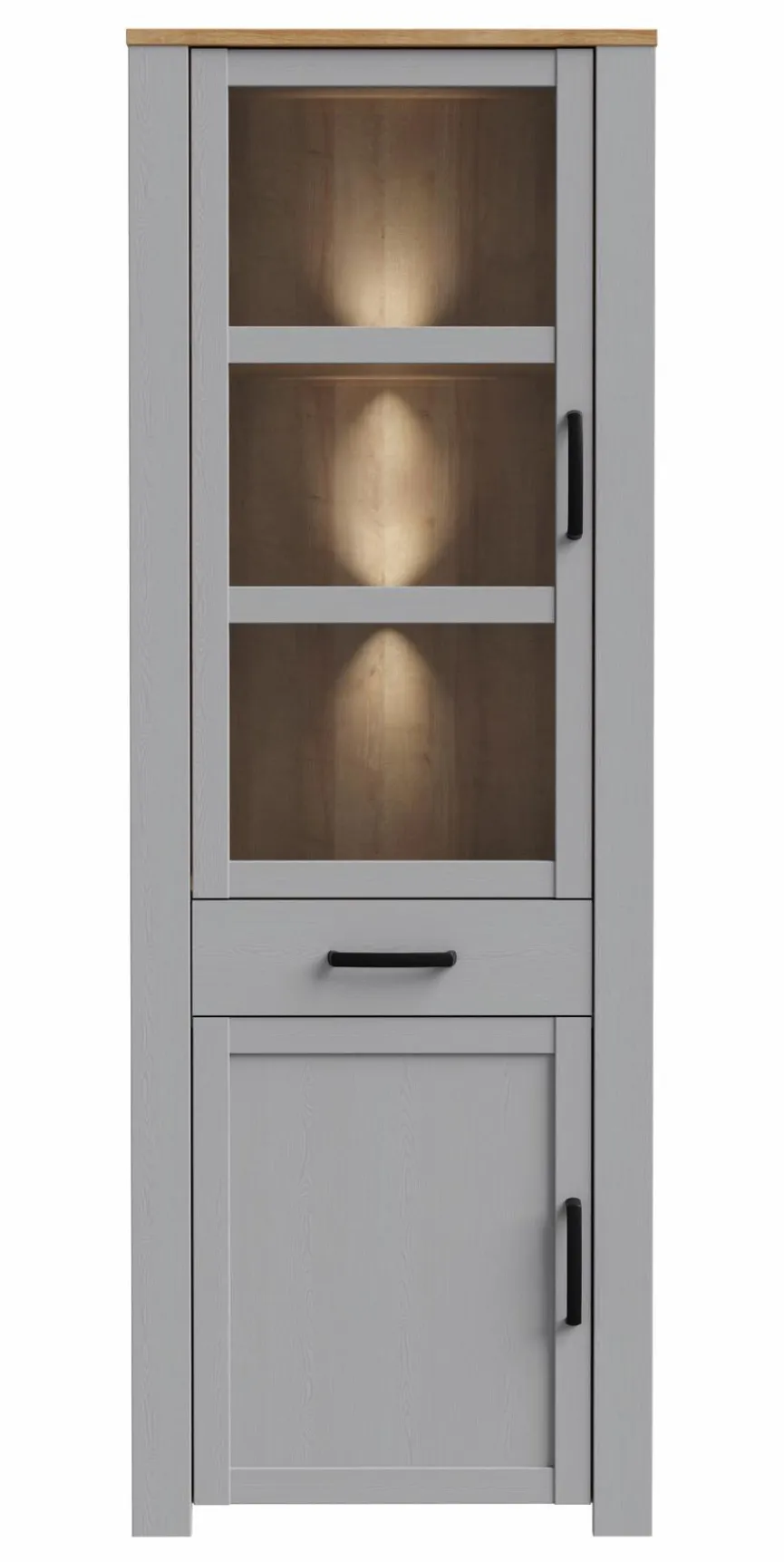 - Mit 2 Türen (obere Türe davon mit Glaseinsatz), 3 Böden und 1 Schubkasten