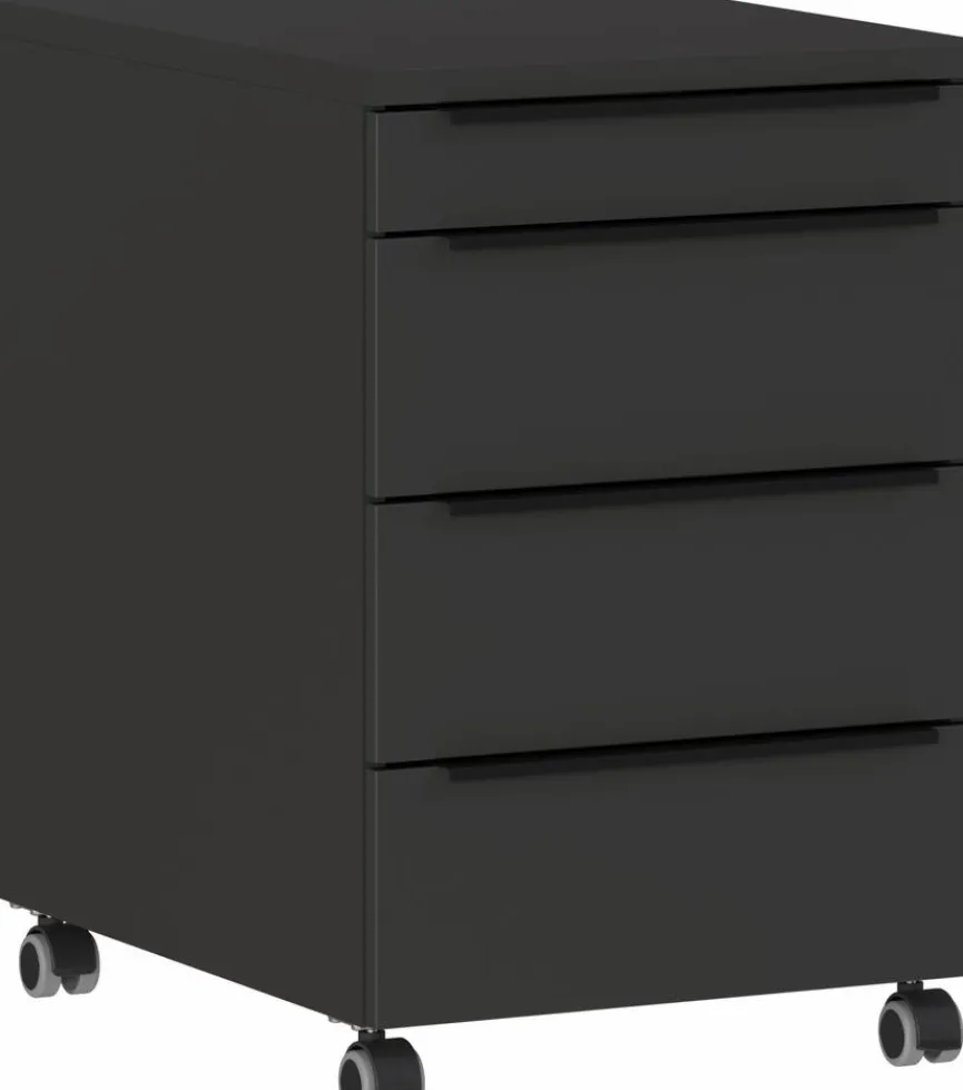 - Kantengriffe aus Metall in Schwarz, gummierte Laufrollen in Schwarz, 2 davon festestellbar