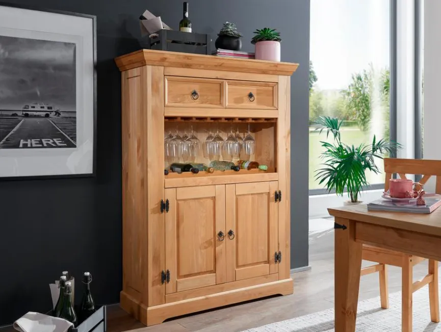 In dem stilvollen Barschrank Alabama können Sie alles für die perfekte Bewirtung Ihrer Gäste unterbringen. Der schöne Schrank ist mit zwei Holztüren und zwei Schubkästen ausgestattet. Außerdem enthält der attraktive Barschrank Alabama einen offenen Teil, in den Sie Flaschen hineinlegen und Gläser aufhängen können.