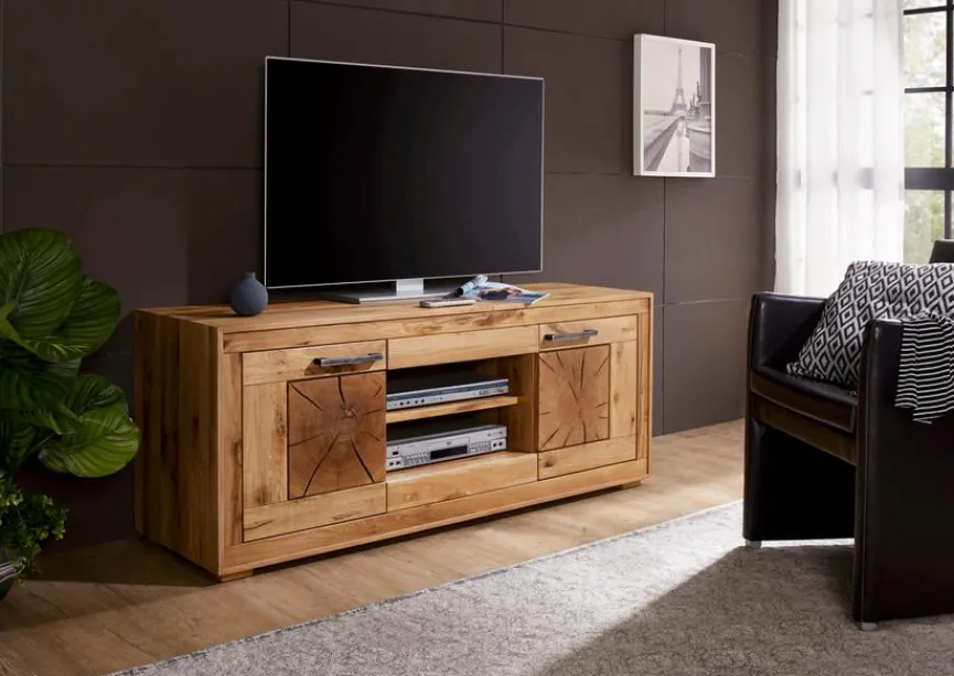 Wer die warme natürliche Ausstrahlung von Holzmöbeln liebt, ist mit dem TV-Lowboard Fort Worth von G+K bestens beraten. Der TV-Unterschrank zeichnet sich durch edles Design, hochwertige Qualität und Holzfronten mit wundervoller Maserung aus. Hinter seinen beiden Türen bietet das TV-Lowboard Fort Worth Platz für viele schöne Dinge, die Sie aufbewahren möchten, und in den offenen Fächern lässt sich Fernsehzubehör wie ein Receiver platzieren.