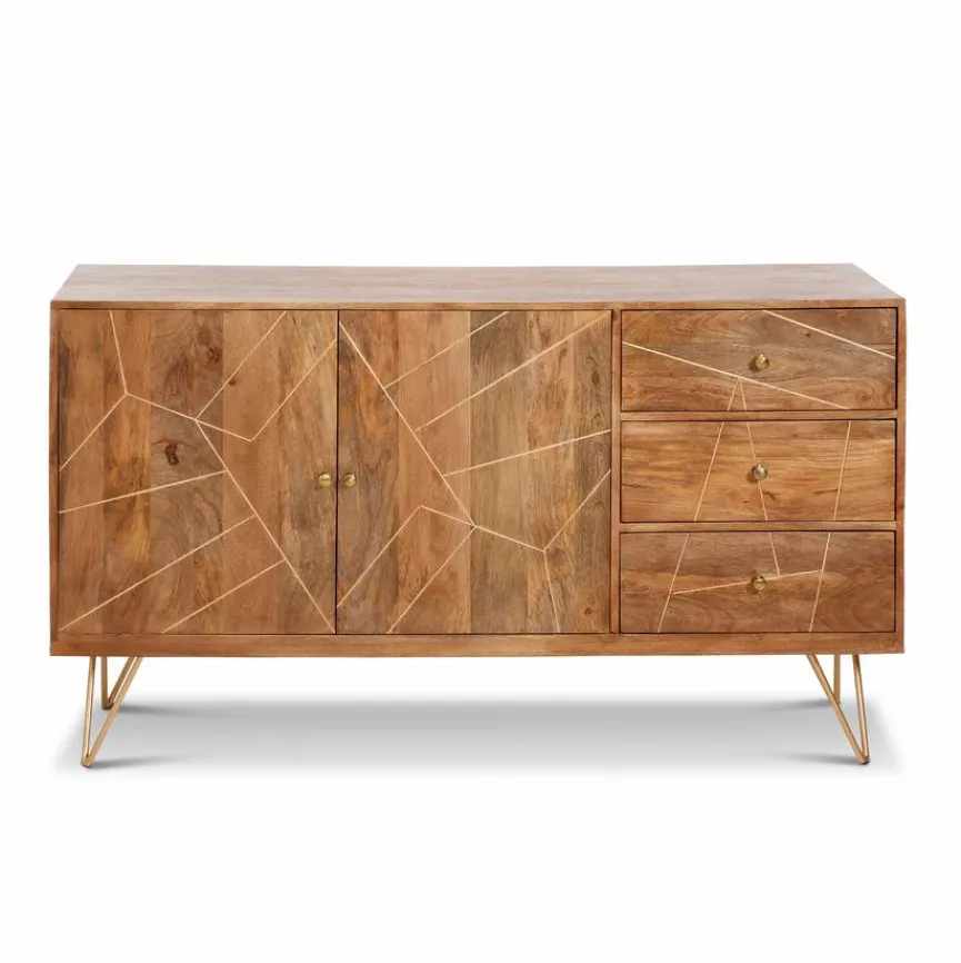 Das Sideboard Scan ist mit seinen schräg gestellten, goldfarben lackierten Füßen und den Einfräsungen im Frontbereich eine Kommode, die alle Blicke auf sich zieht. Mit zwei Holztüren und drei Schubkästen bietet das Sideboard Scan ausreichend Stauraum. Schubladen und Türen werden mit goldfarben lackierten Knöpfen geschlossen. Der Schrank aus hochwertigem Holz ist ein Highlight in jedem Wohnbereich.