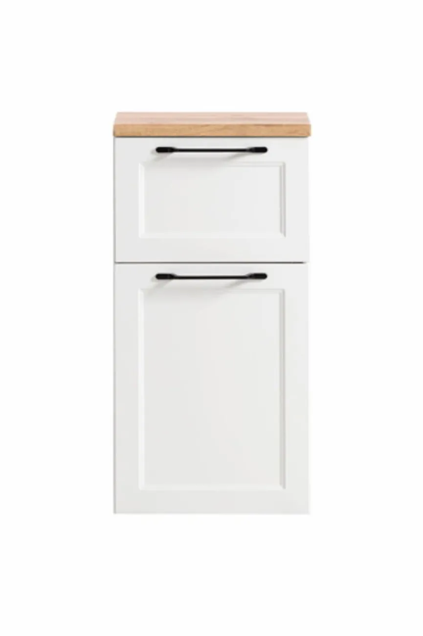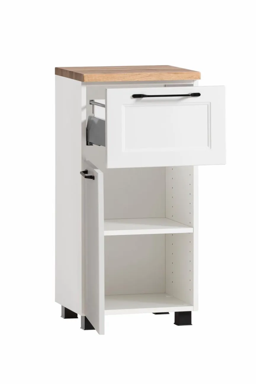 - Mit 1 Türe inkl. 1 Einlegeboden (Belastbarkeit je Boden bis max. 5kg), 1 Auszug mit Softclose-Funktion und Reling