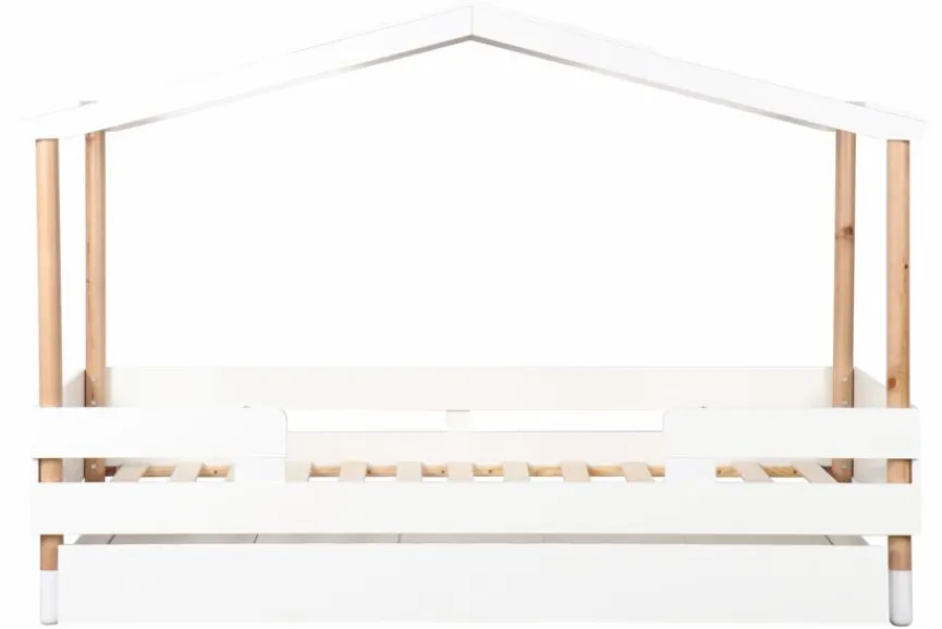 - Seitenteile, Überdachung und Schubkasten aus Holzwerkstoff (MDF) in weiß lackiert, Pfosten und Dachgestell aus massiver, klar lackierter Kiefer
