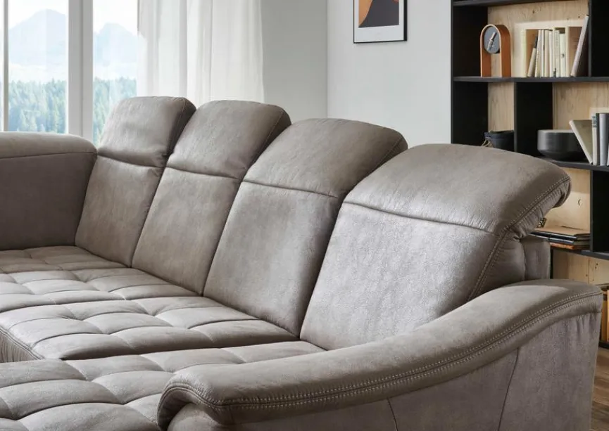 - Wohnlandschaft besteht aus Ottomane mit offenem Abschluss links (1,5KOLKV), Sofa 2,5-Sitzer (2,5ELKV) und Longchair mit Armlehne rechts (CanRKV)