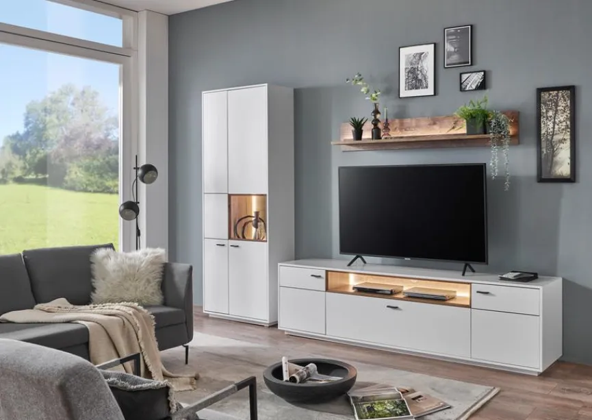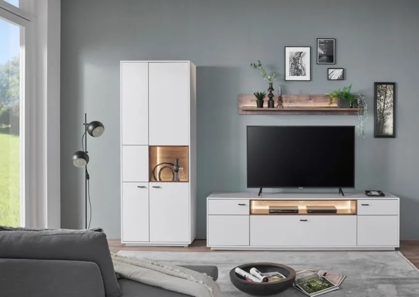 - Wohnwand bestehend aus Vitrine, Wandboard und TV-Lowboard