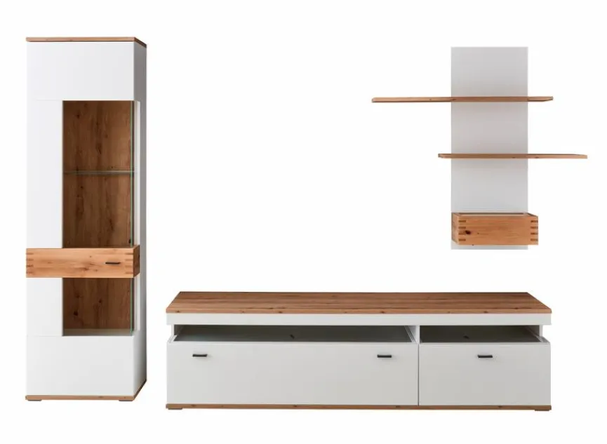 Die dreiteilige Wohnwand Salvani verbindet großzügigen Stauraum und ansprechendes Design für Ihr Zuhause. Die Kombination aus Vitrine, Sideboard und Wandregal lässt sich individuell auf Ihre Raumsituation abstimmen und passt so in jedes Wohnzimmer. Gleichzeitig bietet sie ausreichend Platz für Ihre Unterhaltungselektronik, Bücher oder Dekoration. Mit ihrer schlichten und zeitlosen Farbgebung ist die Wohnwand Salvani ein echter Hingucker mit einem Höchstmaß an Funktionalität.