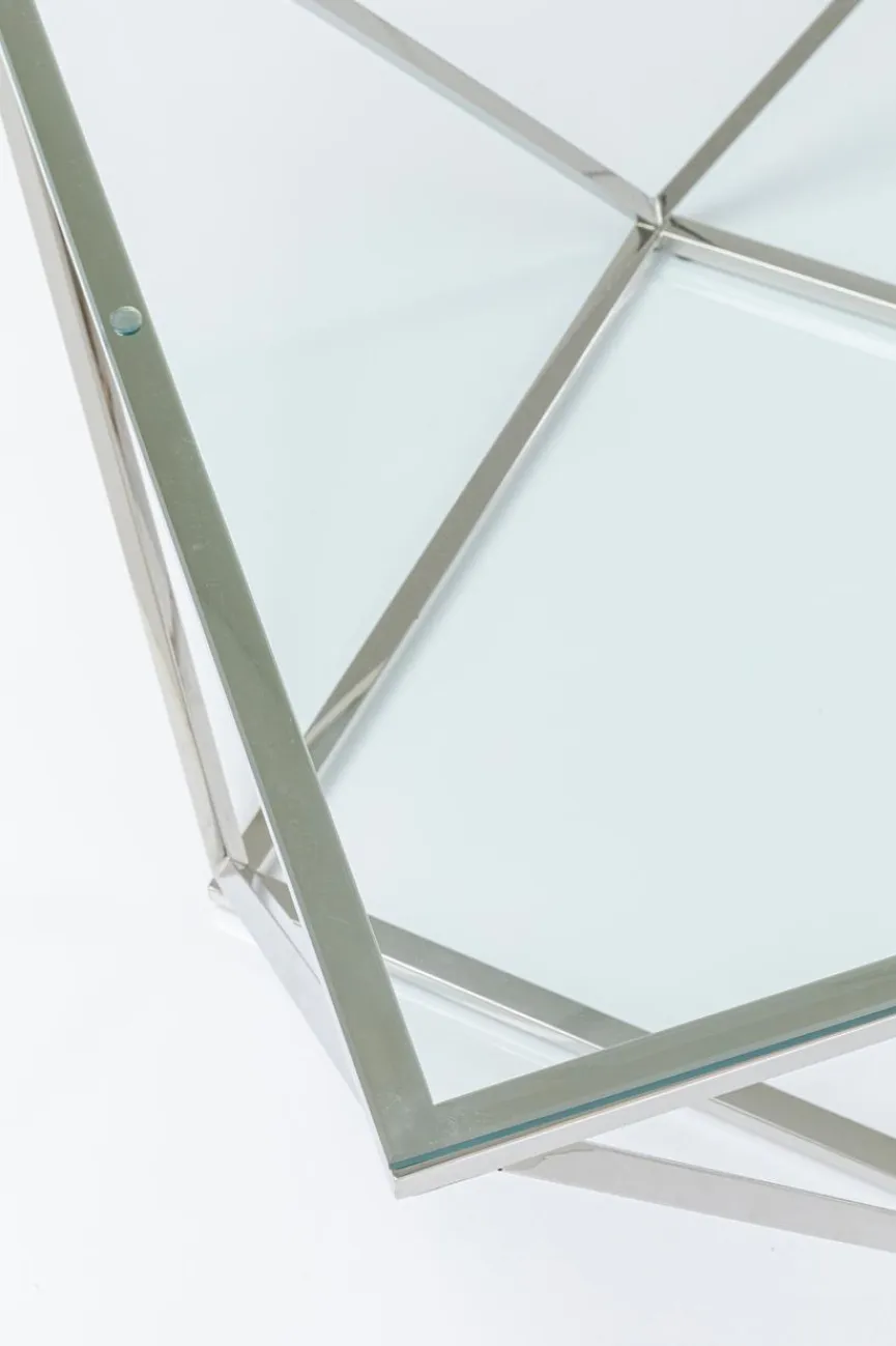 Der handgearbeitete Couchtisch 85030 Cristallo von KARE punktet mit einer kühlen, eleganten Ästhetik, die sich an kristallinen Strukturen orientiert. Auf dem Untergestell, einer geometrischen Konstruktion, ruht eine Glasplatte, sodass Transparenz und Leichtigkeit das raffinierte Design auszeichnen und der Wohnzimmertisch optisch zu schweben scheint. KARE ist bekannt für innovative Ideen und ausgefallene Möbelstücke, zu denen auch der Couchtisch 85030 Cristallo zählt.
