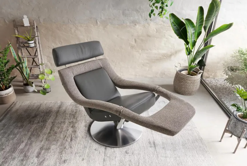 - Bezug Rücken und Kopfteil (1) aus Leder (C-Classic) in pepper mit grauer Kontrastnaht, Bezug Arm- und Fußteil (2) aus Stoff (20-Rain) in beige/grau (93), Fuß Metalldrehteller nickel satiniert (Edelstahloptik)
