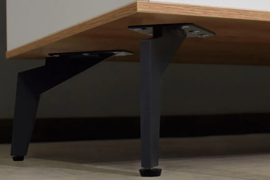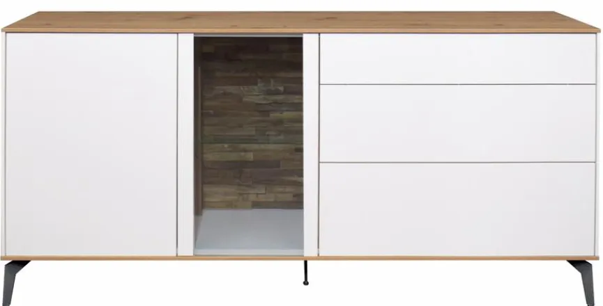 - Aus Holzwerkstoff (Spanplatte) mit kratzfester Melaminharzfolie in ice white supermatt mit Absetzung in Asteiche Nachbildung