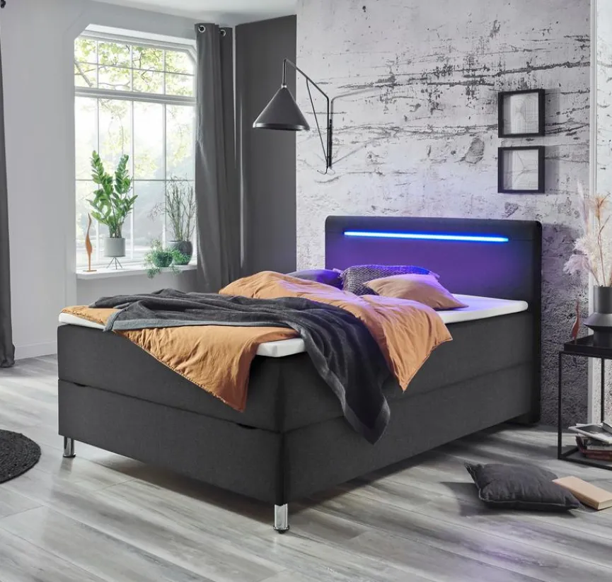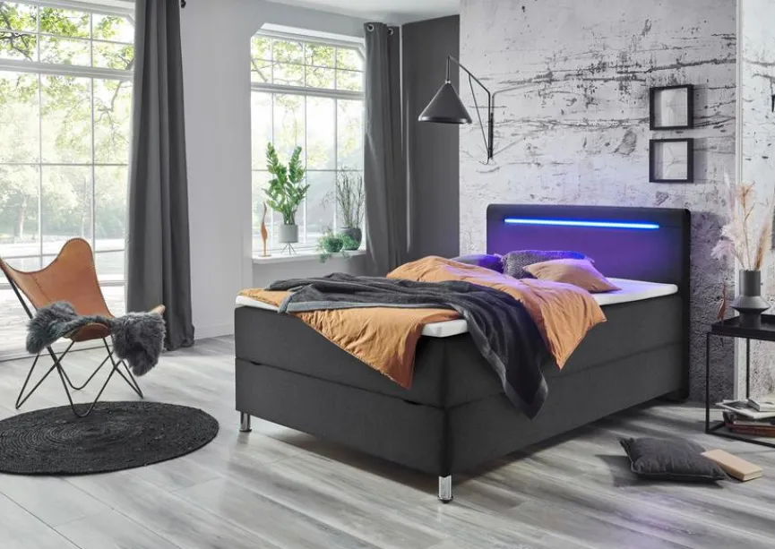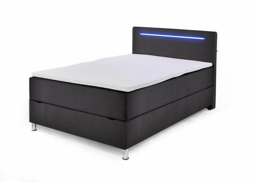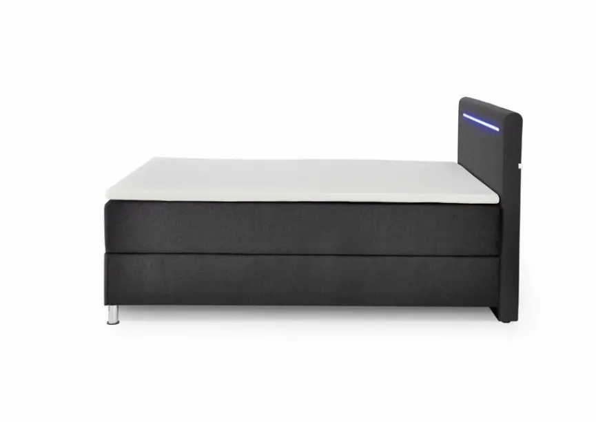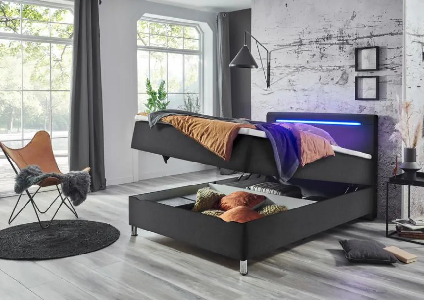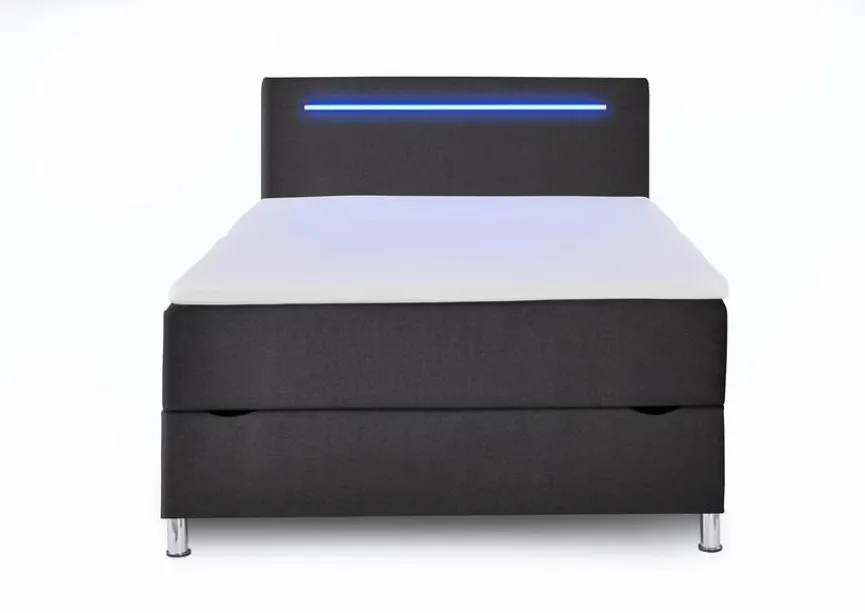 - Inkl. 1 frontal klappbarem Bettkasten, Kopfteil inkl. LED-Beleuchtung in blau