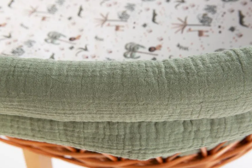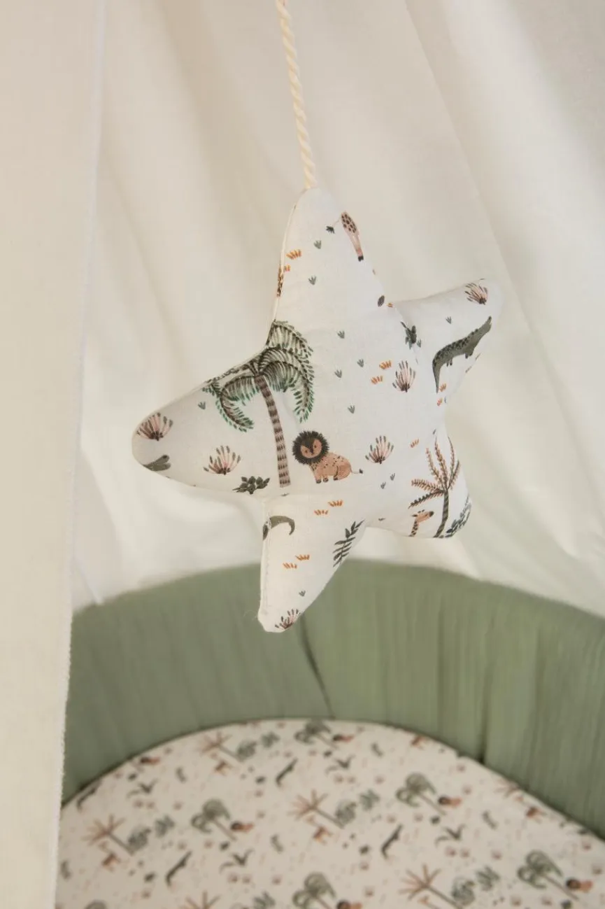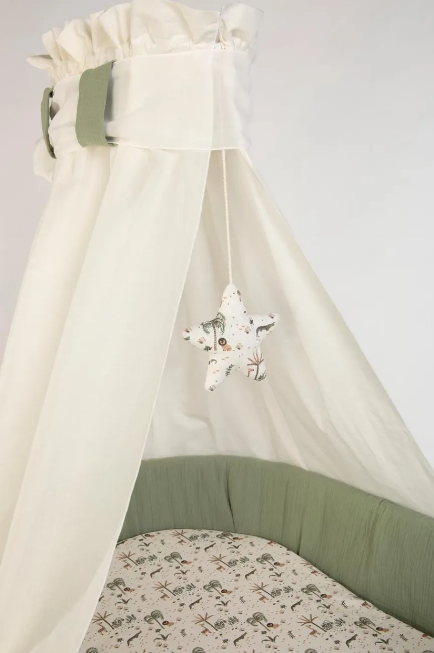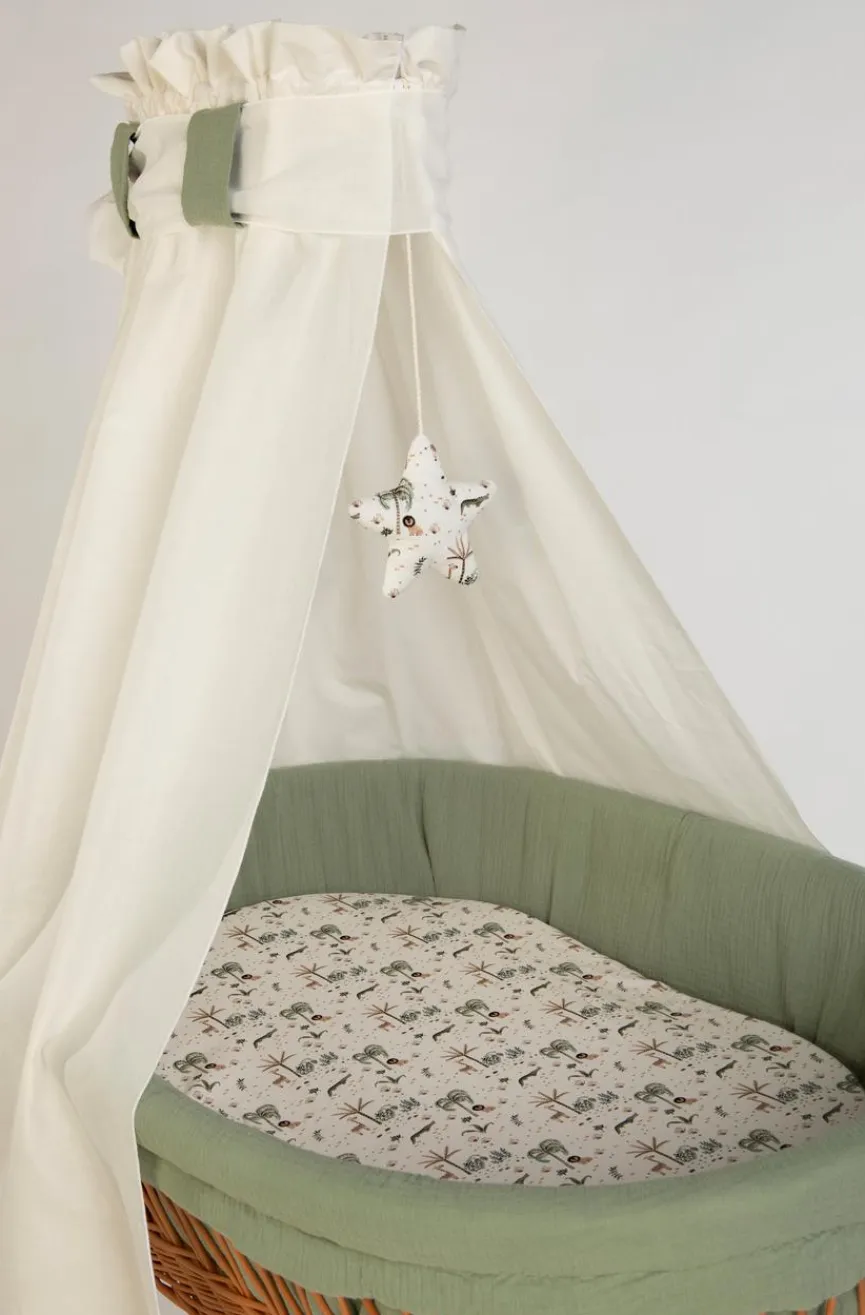 - Bezüge aus Stoff, Himmel in Weiß, Polsterung und Schleife in mintgrün, Mobile und Spannbettlaken im Motiv „Mini Safari“, Bezug Polsterung: 100% Baumwolle, Bezug Spannbettlaken: 100% Baumwolle, Bezug Himmel: 65% Polyester, 35% Baumwolle