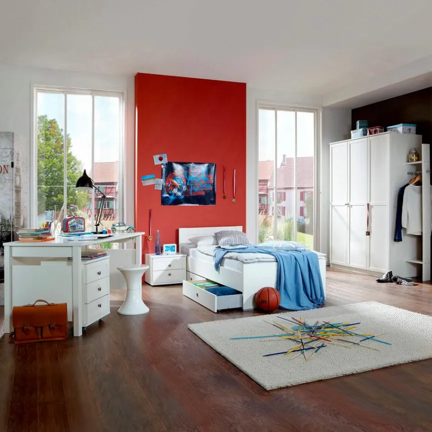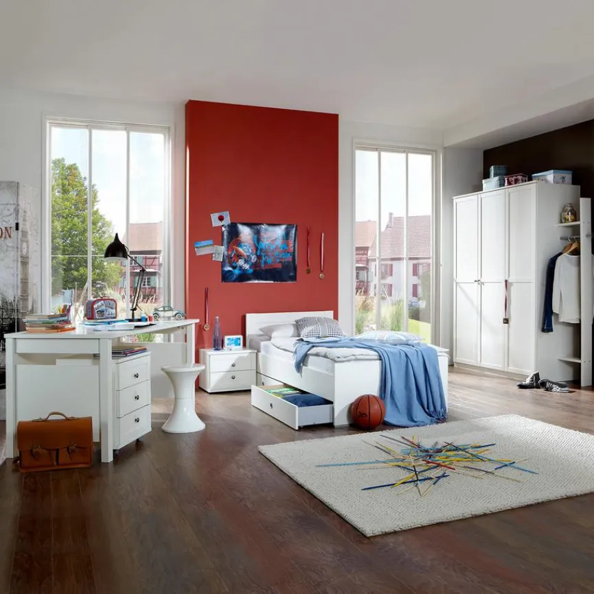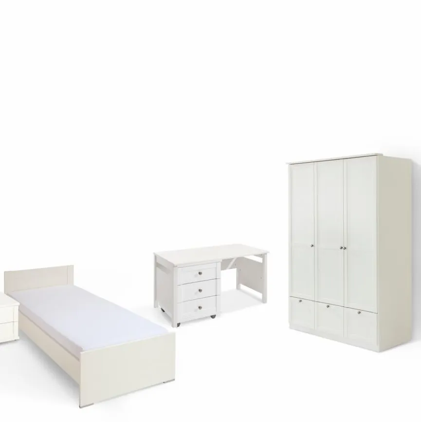 - Set besteht aus Bett 90 x 200 cm, Schrank BHT 135 x 198 x 58 cm, Nachttisch BHT 46 x 38 x 40 cm, Schreibtisch BHT 140 x 72 x 70 cm und Rollcontainer BHT 46 x 59 x 45 cm