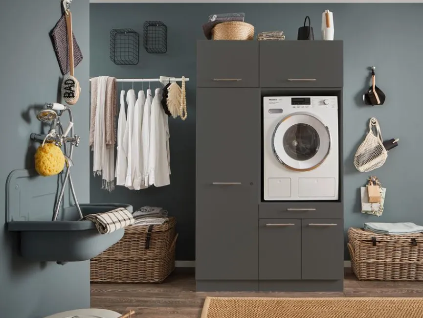 - HWR-Kombination aus Hochschrank, Stauraumschrank und 2 Aufsatzschränke