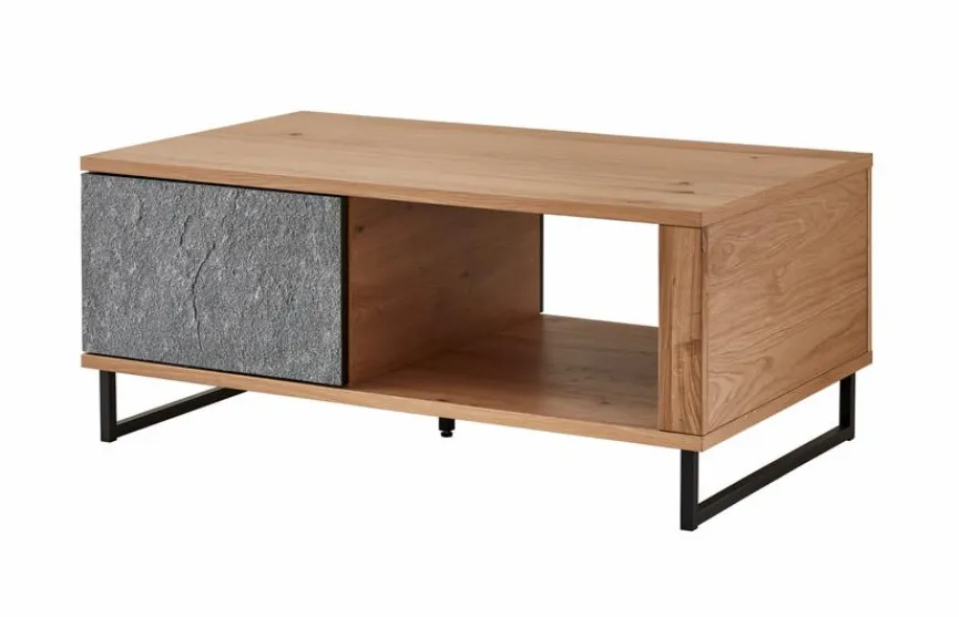 - Korpus aus Holzwerkstoff (Spanplatte) in Asteiche furniert, Front aus massiver Asteiche Lamelle Bianco geölt, Absetzung in Naturstein