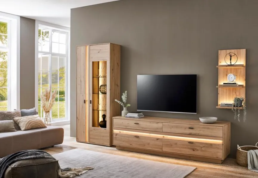 - Bestehend aus Vitrine, TV-Lowboard und Wandregal
