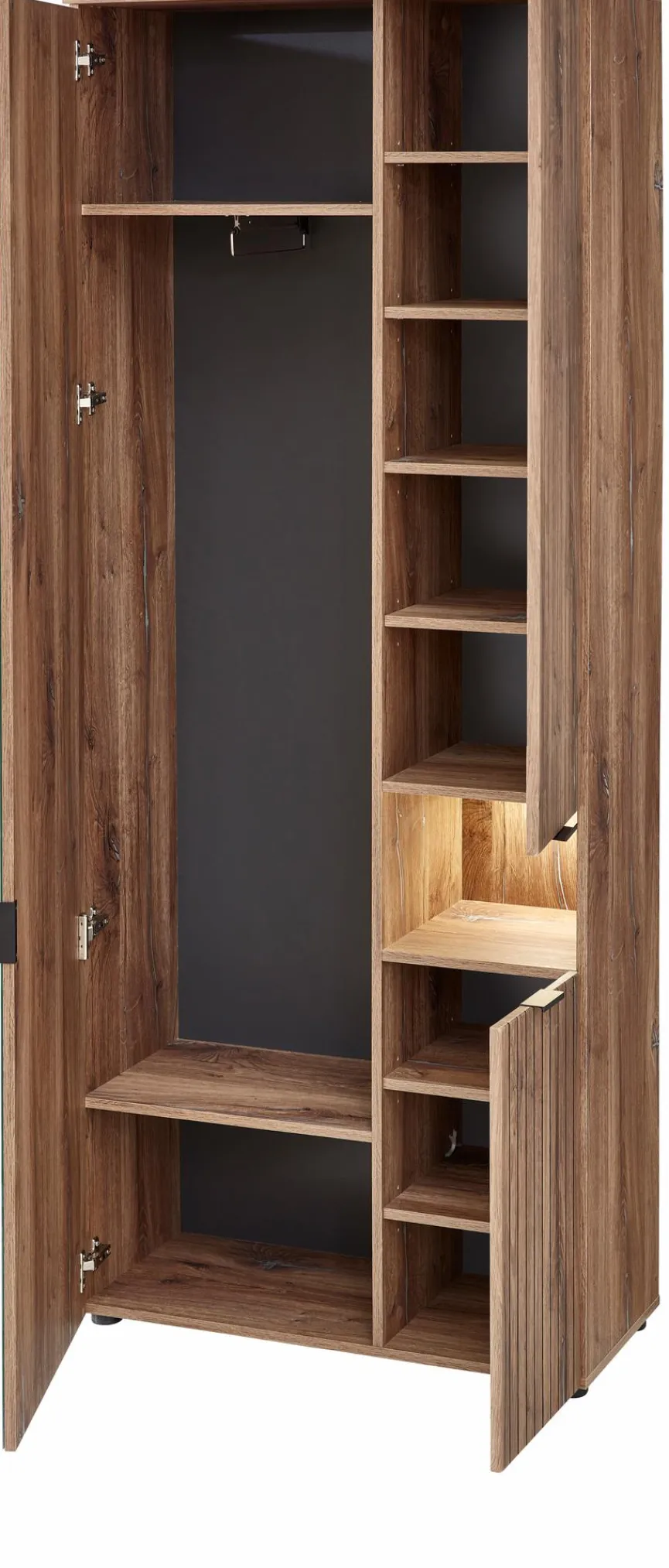 - Mit 1 Spiegeltüre, 2 Holztüren, 1 offenen Fach mit LED-Beleuchtung, 1 Konstruktionsboden mit ausziehbarer Kleiderstange und 6 Einlegeböden