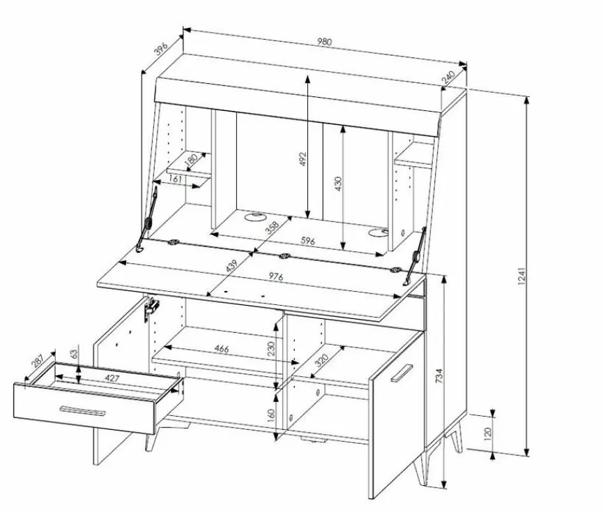 - Mit 1 Klappe, 2 Schubkästen und 2 Türen