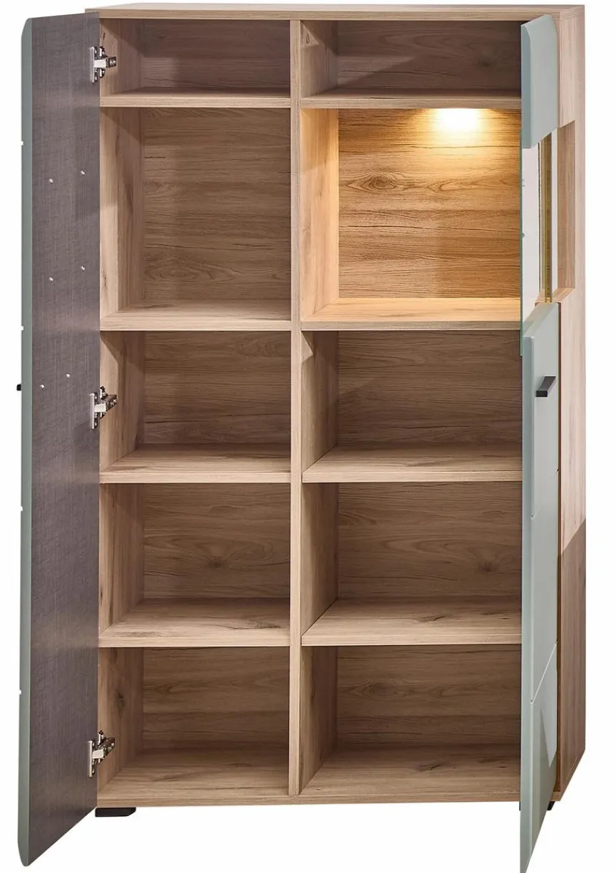 - Korpus und Böden aus Holzwerkstoff (Spanplatte) mit Dekorfolie in Viking Oak Nature Nachbildung, Front aus Holzwerkstoff (MDF) mit Tiefziehfolie in schilfgrün, Absetung aus Holzwerkstoff (MDF) mit Tiefziehfolie in Hirnholz Nachbildung