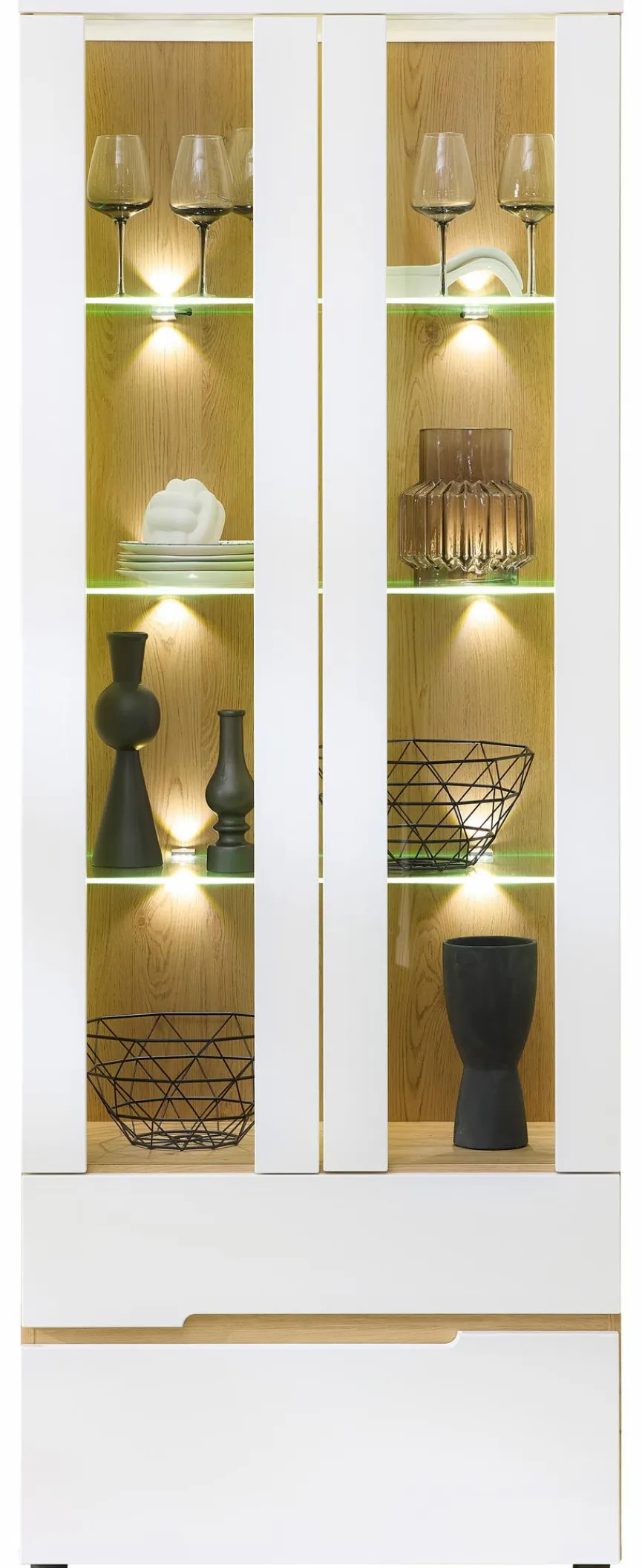 - Mit 2 Türen mit Glaseinsatz, 3 Glaseinlegeböden und 2 Schubkästen