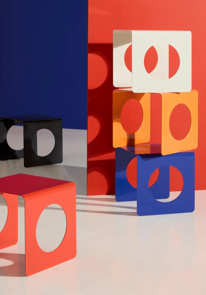 Ein lebendiges Statement-Möbelstück mit mutigen Farben, hochglänzender Oberfläche und kreisförmigen Ausschnitten. Kompakt und funktional, bietet es praktischen Stauraum und hohe Langlebigkeit, indem es ein verspieltes Design mit moderner Ästhetik kombiniert. Größe: 33 × 33 × 33 cm. Erhältlich in Ultramarin, Verkehrsrot, Reinorange, Hochglanz-Schwarz oder Grauweiß.