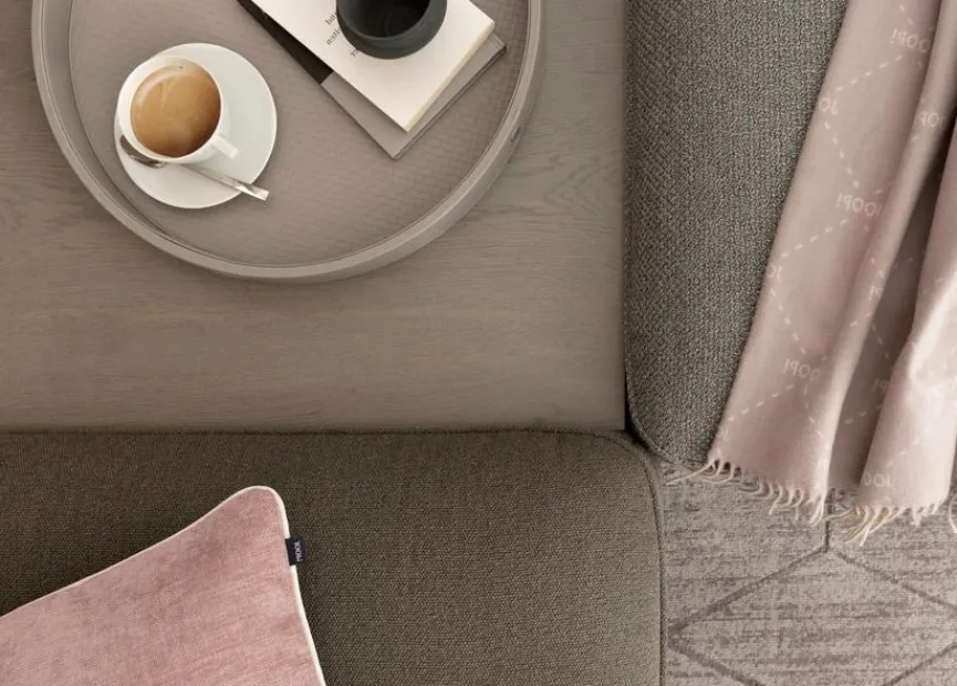 - Bezug vom Zwischenelement und Abschlusselement aus Stoff (Oasis 30) in tundra, Bezug vom Zwischenelement aus Stoff (Fashion 24) in rauch, Füße Metall anthrazit pulverbeschichtet (K)