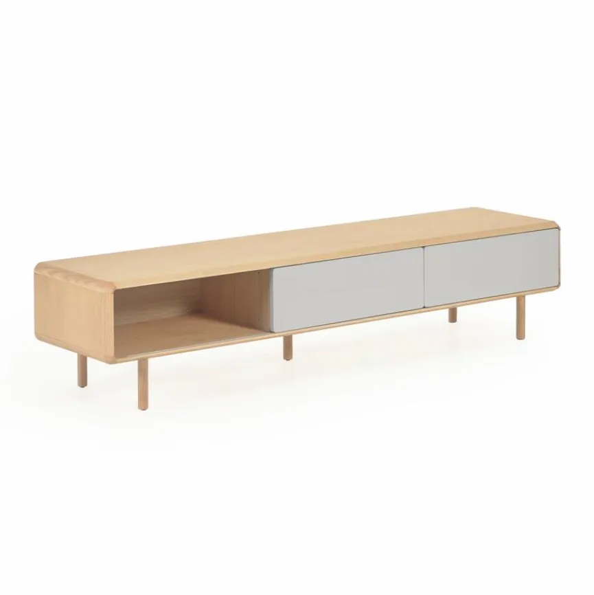 Das TV-Lowboard Anielle von Kave Home ist der perfekte TV-Unterschrank für das stilvoll eingerichtete Wohnzimmer. Es bietet Stauraum für unterschiedlichste Utensilien und eignet sich hervorragend als Platz für CD-Player, Spielekonsole und weitere Heimelektronik. Der Mix aus Vintage und modern mit farblich abgesetztem Korpus und abgerundeten Kanten macht das TV-Lowboard Anielle zu einem schicken Accessoire.