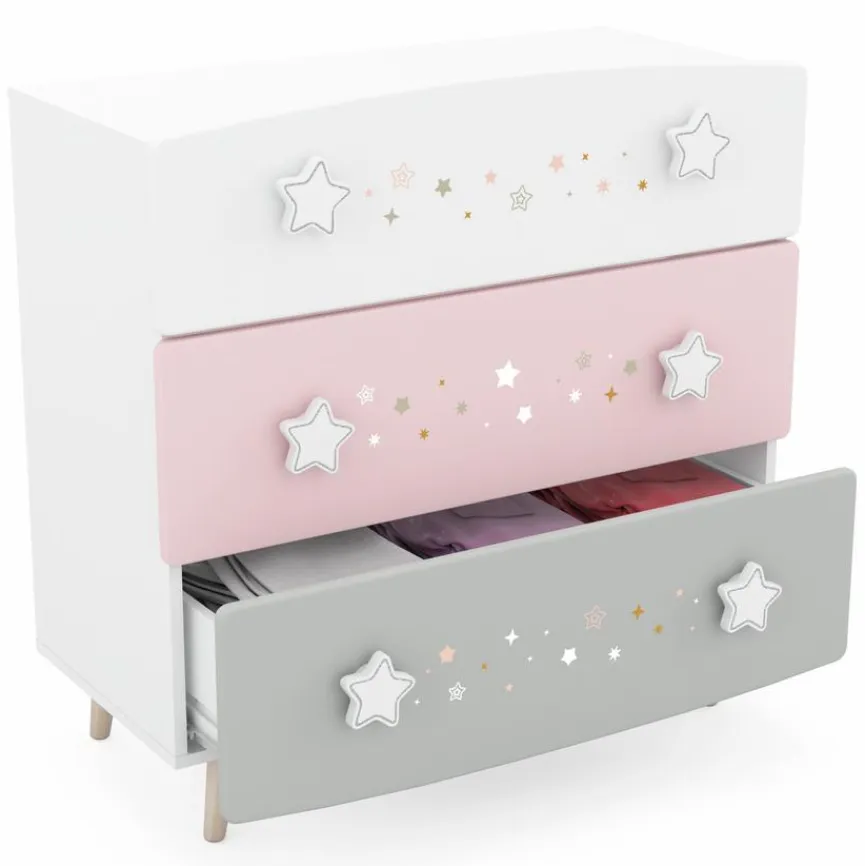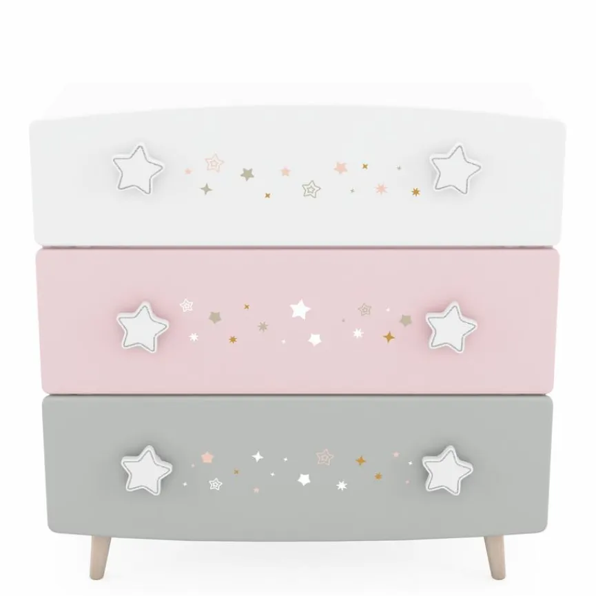 Mit der bezaubernden Kommode Stella werden Mädchenträume wahr. Das Design besticht mit sanften und harmonischen Farben. Ein besonderer Blickfang sind die sternförmigen Griffe und die Sternmotive auf der Front. Doch auch der praktische Aspekt kommt bei der Kommode Stella nicht zu kurz. So können Sie Kleidung und Spielsachen bequem in den Schubkästen verstauen.