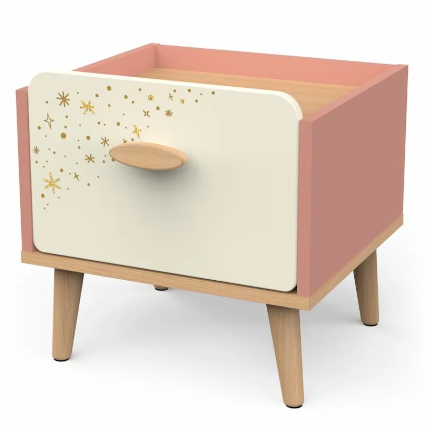 - Aus Holzwerkstoff (MDF) mit Lack in Apricot, Abdeckblätter aus Holzwerkstoff in Vincenza-Eiche Nachbildung, Front aus Holzwerkstoff (MDF) in Vanilla, Füße aus massiver Eiche, inkl. Sternenmotiv im Siebdruckverfahren