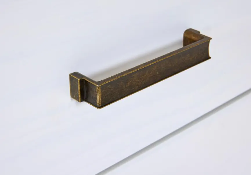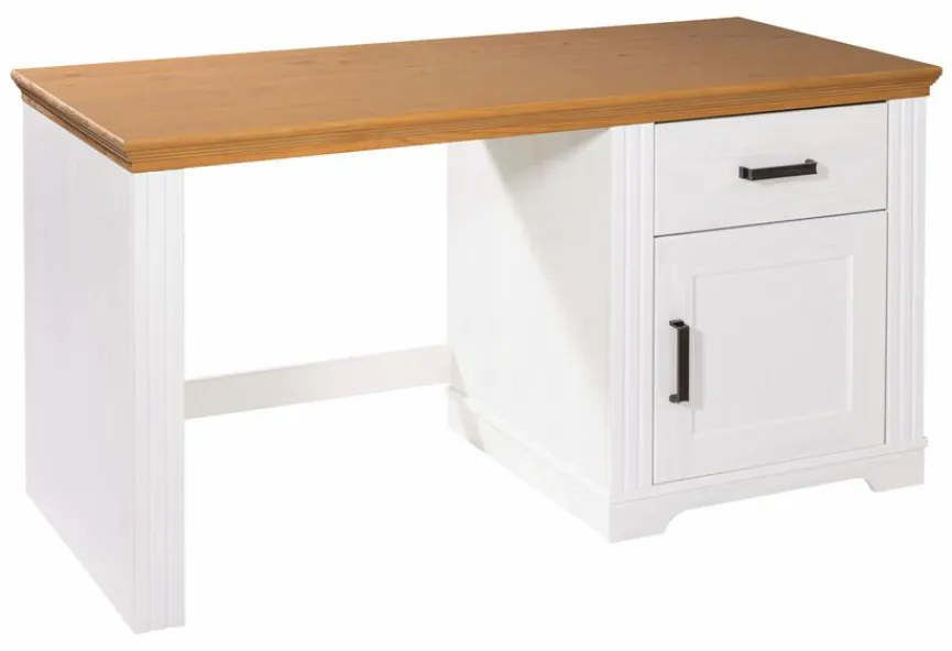- Aus massiver und lackierter Kiefer in weiß, Deckplatte von Schrank, Nachttisch und Schreibtisch sowie Fries an Kopf- und Fußteil beim Bett in „Oak Colori“, Griffe aus Metall in schwarz