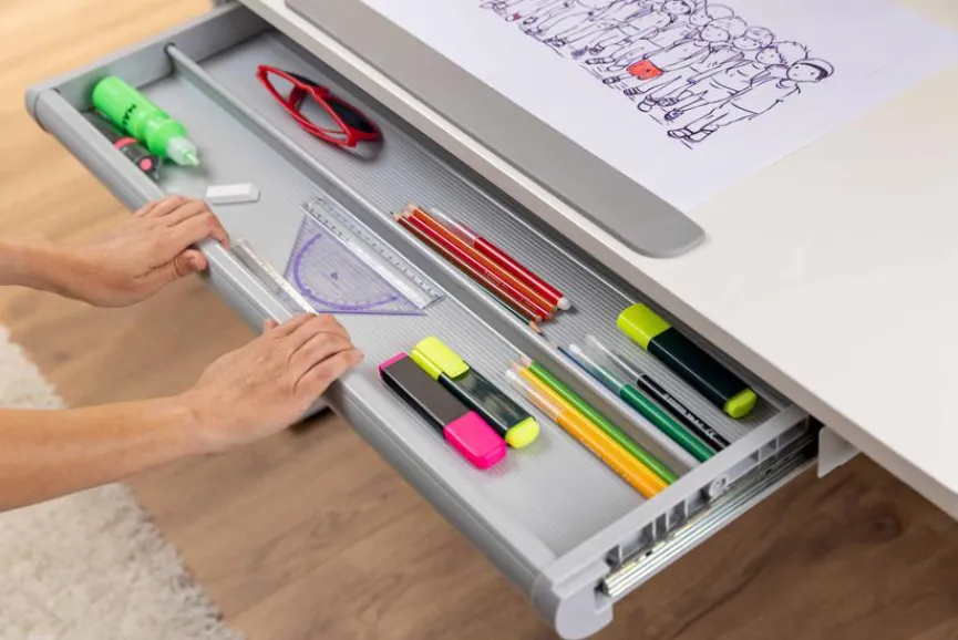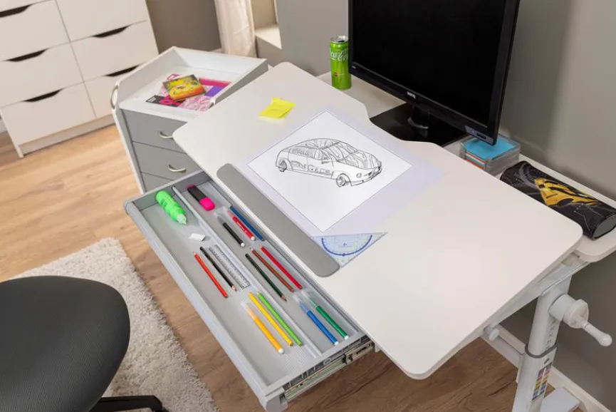 - Tischplatte in einen größeren, vorderen, neigungsfähigen Teil und einen schmalen, feststehenden Teil unterteilt