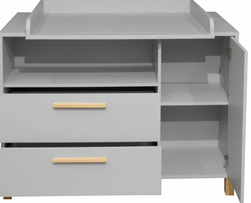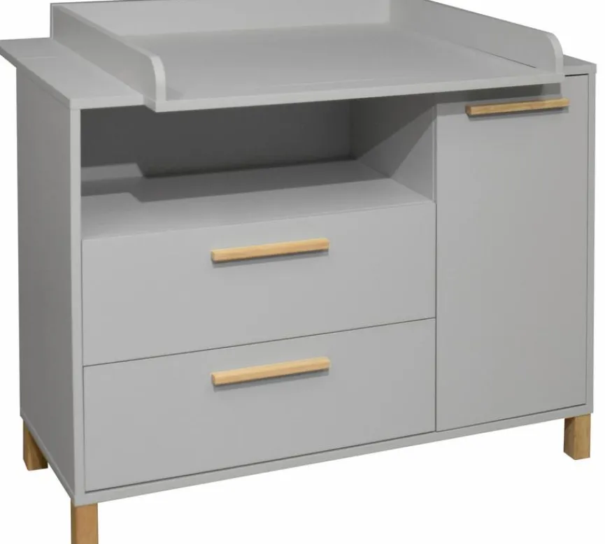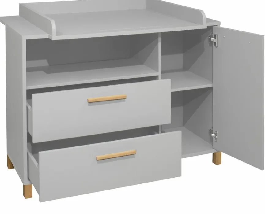 - Aus Holzwerkstoff (Spanplatte) mit kratzfester Melaminharzfolie in Kreidegrau Matt Lack, Füße und Griffe aus massiver Eiche