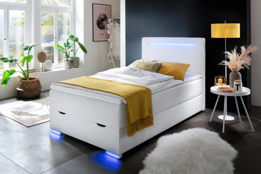 - Mit Bonellfederkernmatratze 120 x 200 cm, Bonell-Boxunterbau und Bonellfederkernmatratze befinden sich zusammen in einem durchgehenden Bezug
