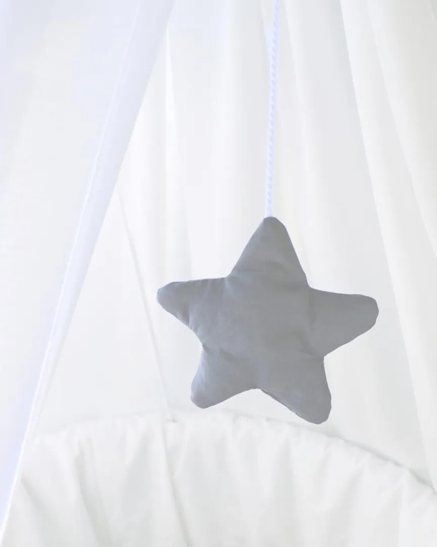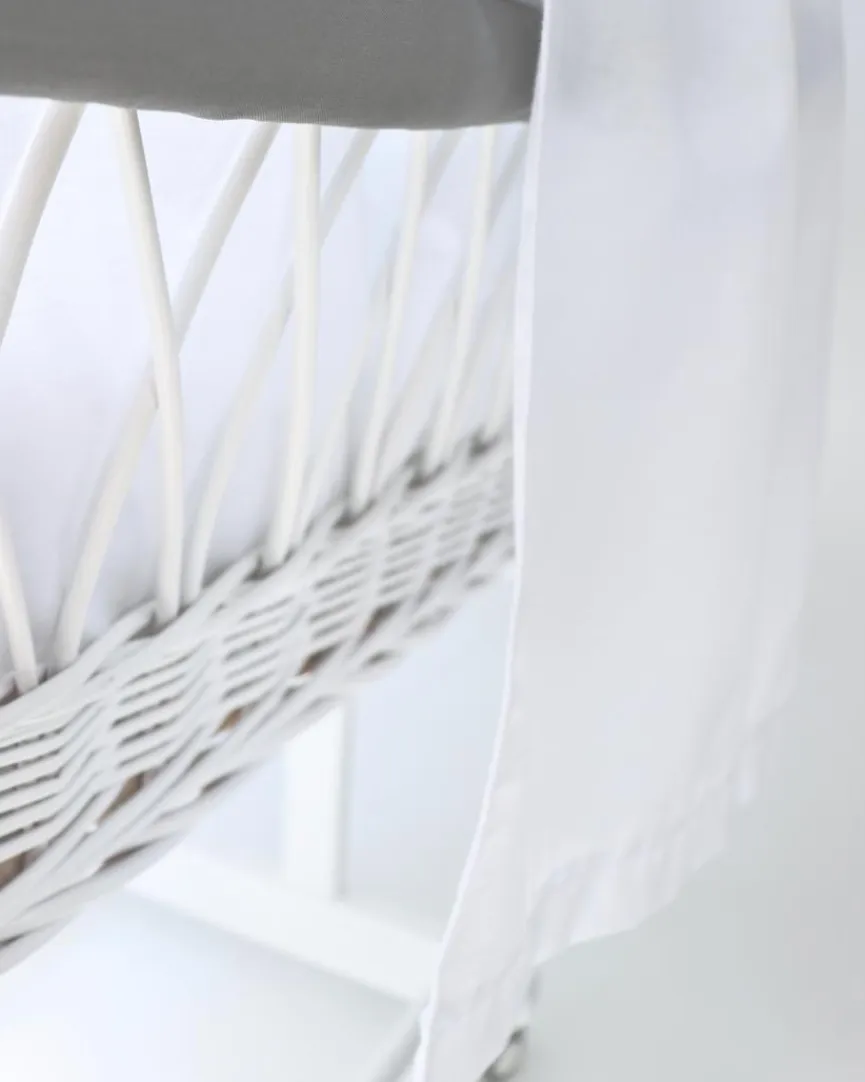 - Bezüge aus Stoff in Weiß, Mobile, Schleife, Spannbettlaken und Bordüre aus Stoff in dunkelgrau, Bezug Polsterung: 100% Baumwolle, Bezug Spannbettlaken: 100% Baumwolle, Bezug Himmel: 65% Polyester, 35% Baumwolle